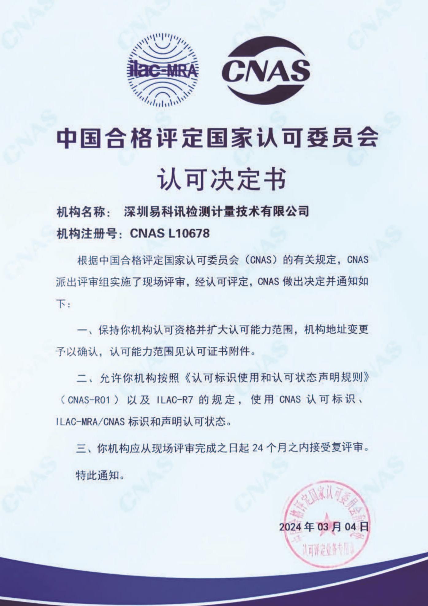深圳易科讯检测计量技术有限公司(以下简称“易科讯检测”) 成立于2015年6月,专业从事仪器仪表的计量校准、产品检测和相关信息培训咨询的国家第三方校准/检测机构,是中国合格评定国家认可委员会(CNAS)认可的实验室(认可注册号CNASL10678),获得CNAS及CMA认可资质,所出具的数据均可溯源到国家计量基准和国际单位制(SI),所出具的证书完全满足ISO/IEC17025和ISO9000的溯源要求。 公司时刻铭记质量是易科讯发展的基石,是客户信赖我们的核心,为方便服务全国各地客户,在深圳、上海、济南、益阳、合肥、苏州、武汉、成都、河南、东莞、襄阳等地设立办事处,以提供高质量、快捷、准确的校准服务。 易科讯检测拥有一支专业、严谨、高效的技术团队以及严格的实验室管理体系,聘请了行业经验丰富的技术专家及技术顾问,实验室配备了先进的高精度校准、检测设备。认可范围覆盖电学、无线电、长度、力学、热学、理化、电力等多项专业领域,可为客户提供一站式计量技术服务。 |